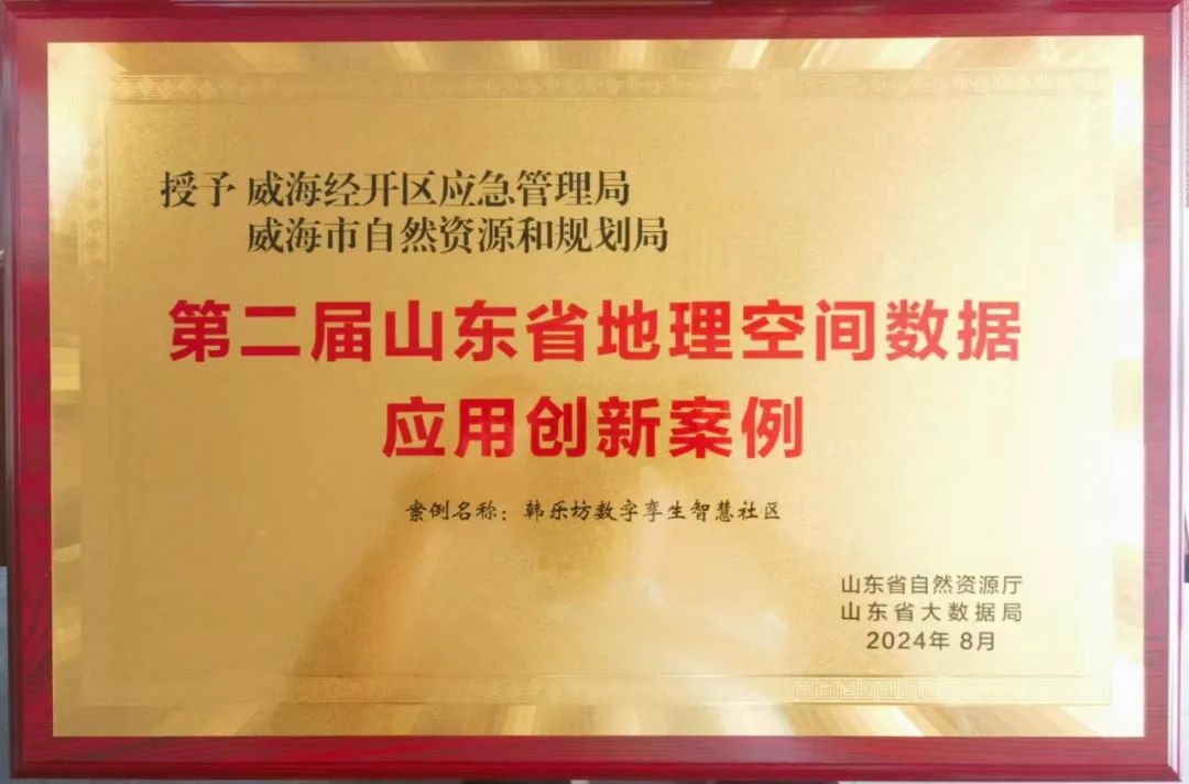 本次全省共評選出20個創新案例,我市推薦的“韓樂坊數字孿生智慧社區”、“海陸一張圖在漁船管控系統中的應用”案例分別榮獲經濟社會類、自然資源類山東省第二屆地理空間數據應用創新案例。
